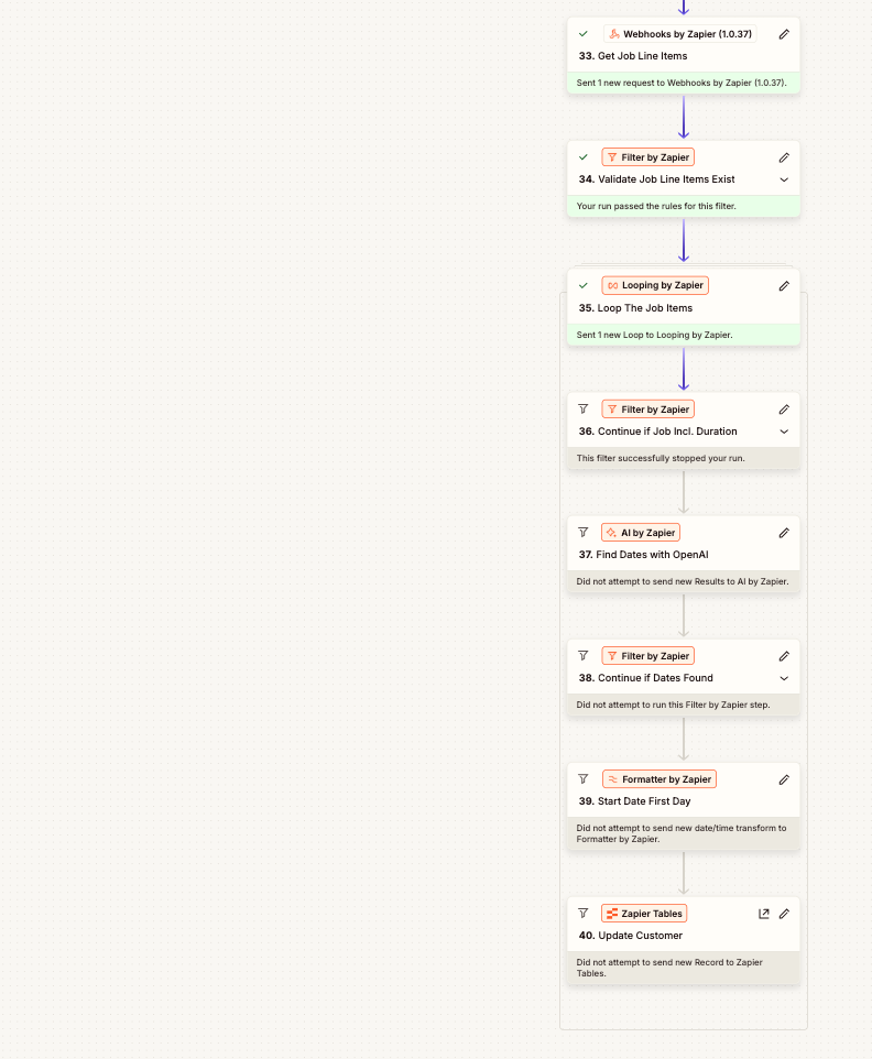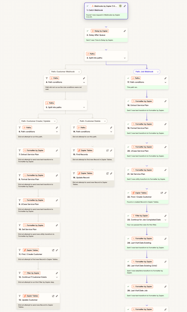 Each webhook payload was processed by a single, complex Zap containing 38 actions, responsible for normalizing, validating, and updating customer records.